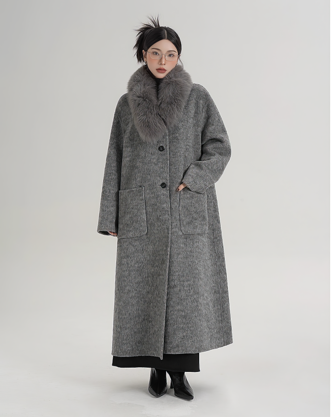 上質なウールに希少なアルパカの毛をブレンドし、滑らかで温かみのある風合いに仕上げたロングコート。首元にはボリューム感のある華やかなファーを配しており、シーンやコーディネートに合わせて取り外しができる2WAY仕様が最大の魅力です。ファーを取り外せば、すっきりとしたノーカラーのVラインが都会的で知的な印象を与え、ハイネックやアクセサリーとのレイヤードを美しく引き立てます。ストンと落ちる優雅なロングシルエットとミニマルなシングルボタンのデザインが、洗練された大人の余裕を演出し、デイリーからフォーマルまで幅広く活躍します。