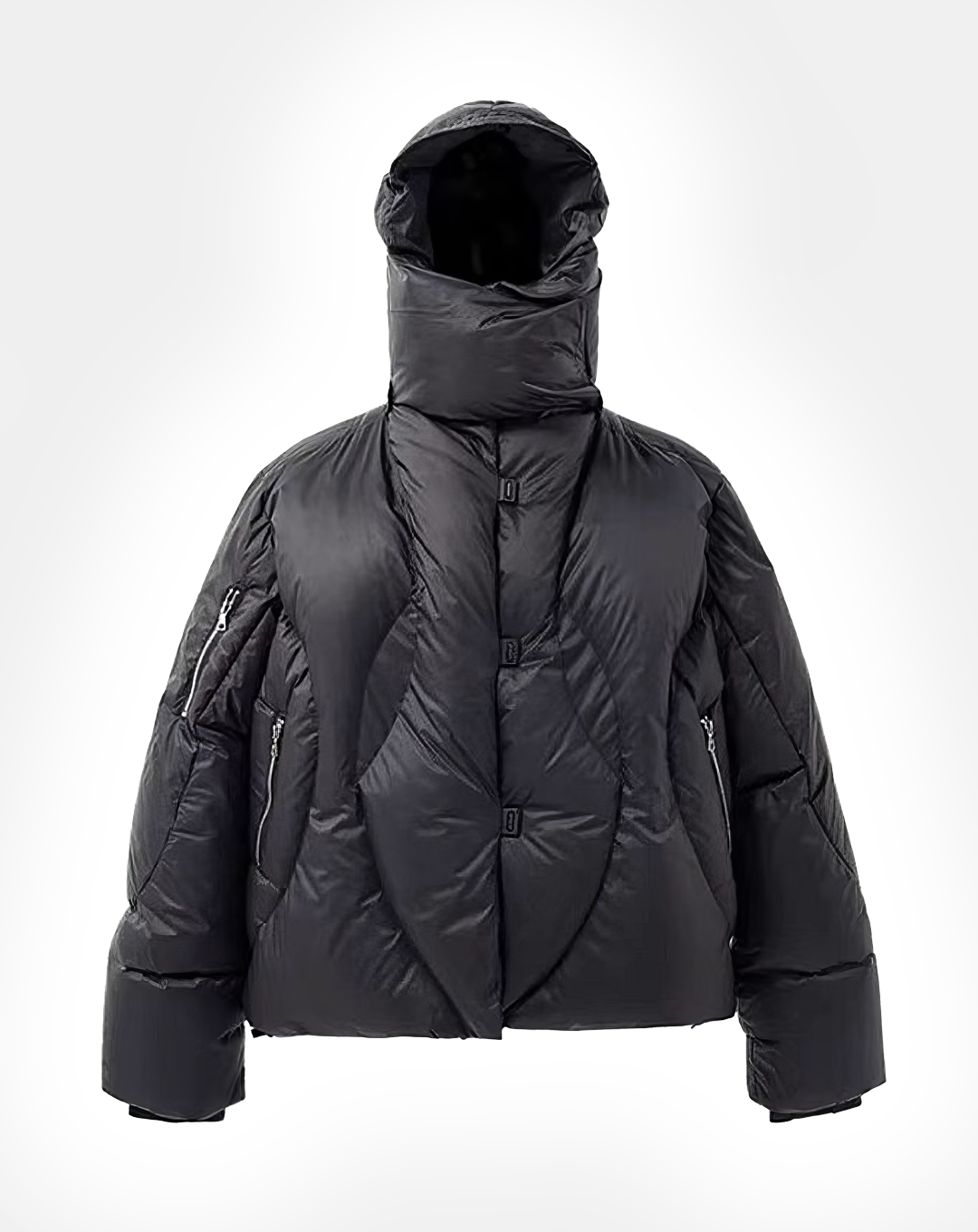 フードが取り外し可能なダウンジャケット。天候やスタイルに応じて調整できます。またファスナーとボタンの二重閉じ仕様で、風を完全にシャットアウト。寒い季節を快適に過ごせるアイテムです。やや光沢感のある素材となります(素材アップの写真をご参考ください)