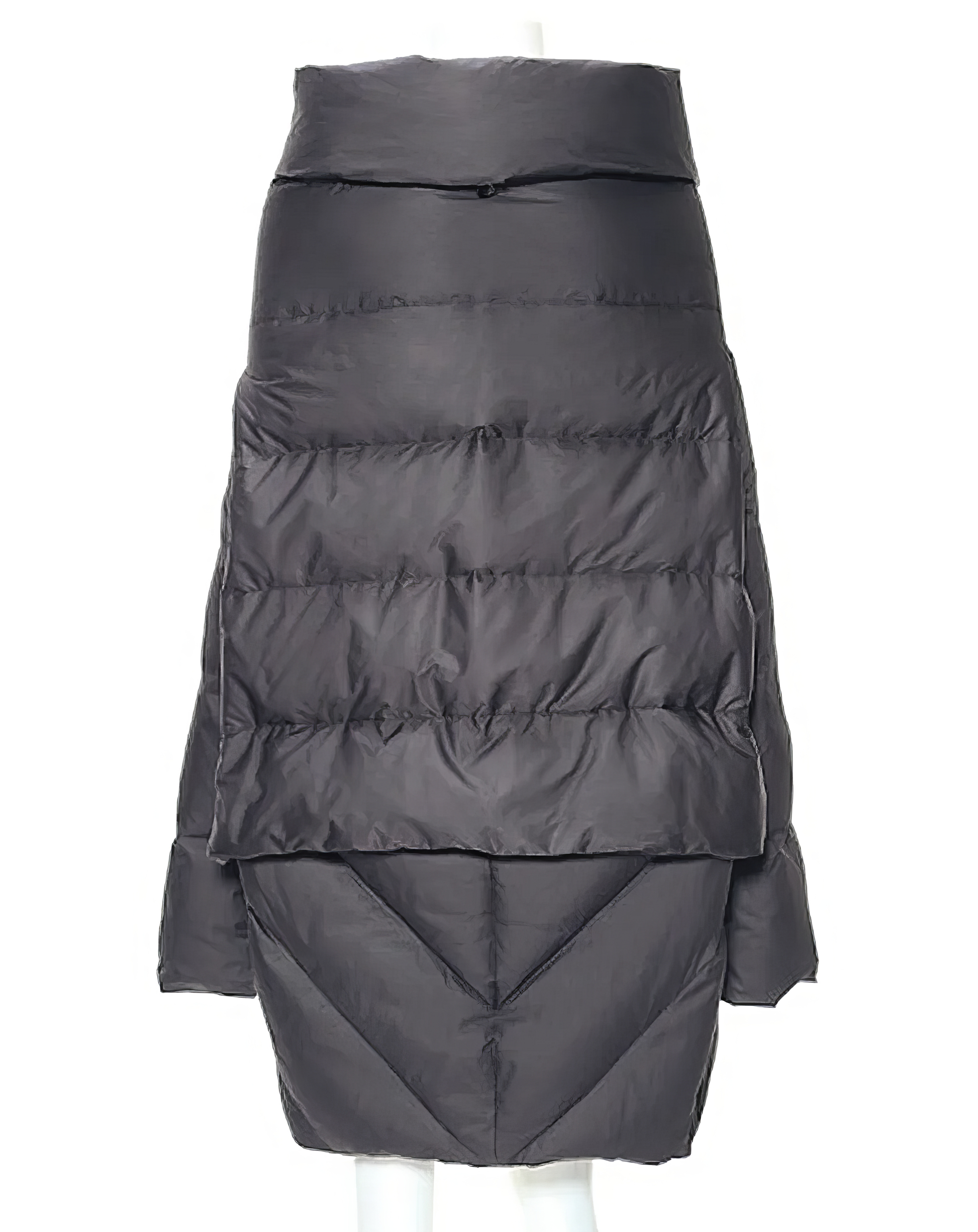 ホワイトダックダウンが用いられた、軽くて暖かいダウンジャケットです。斜めに巻かれたようなデザインが個性を引き立てます。デザイン性も機能性も兼ね備えた一着です。