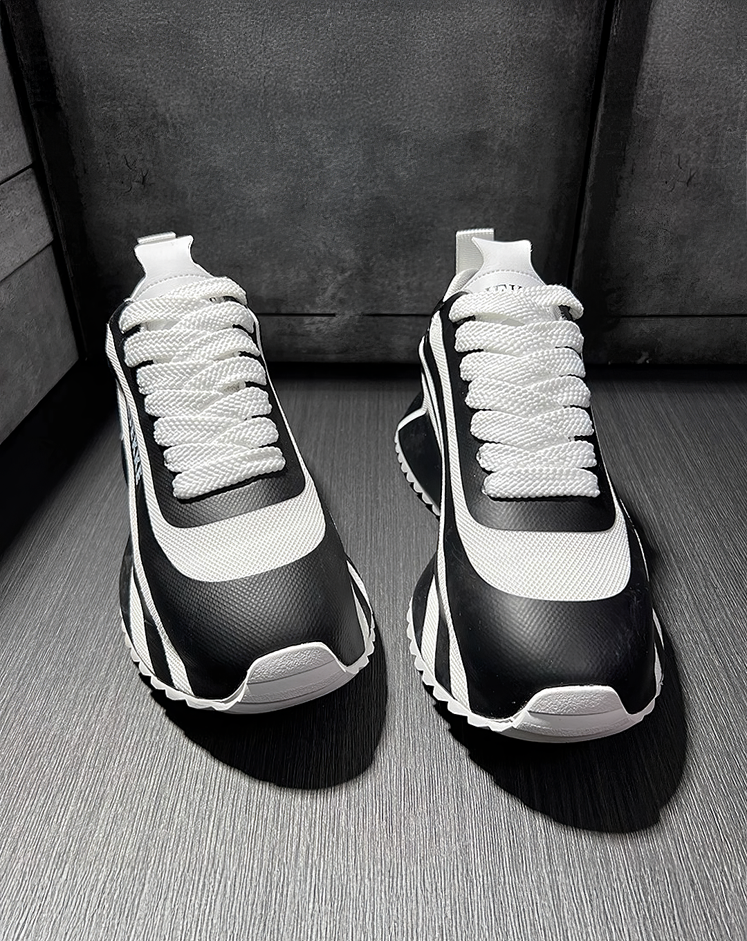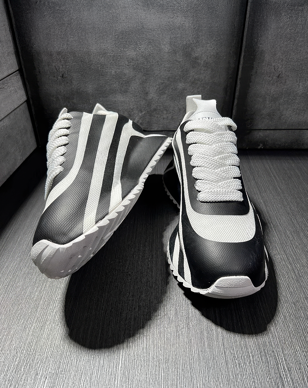 大胆なストライプデザインが目を引く、ユニセックス仕様のスニーカー。ボリューミーなソールが足元に存在感を与え、ストリートスタイルを格上げします。ブラックとシルバーとホワイトの3色展開で、カジュアルなスタイルはもちろん、シンプルなコーディネートの外しアイテムとしても活躍します。