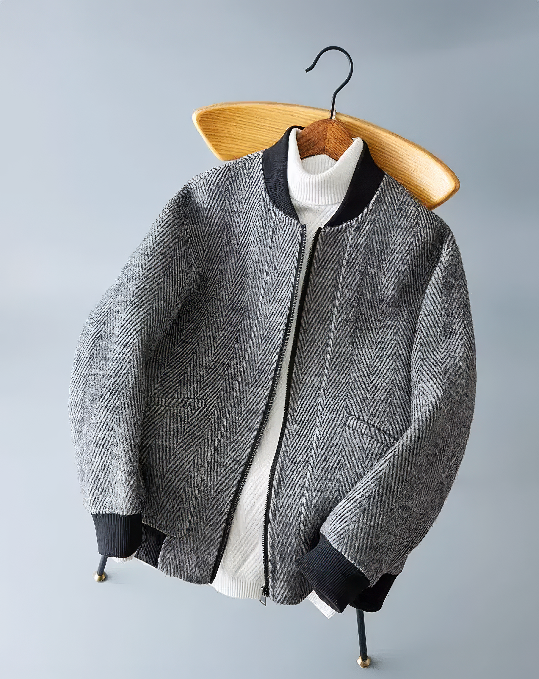 洗練されたヘリンボーン柄の編地が目を引く、大人の余裕を感じさせるジップアップブルゾン。スタジアムジャンパーのスポーティなシルエットに、落ち着いたモノトーンの織り柄を落とし込むことで、カジュアルになりすぎず上品な印象を演出します。襟元や袖口、裾に施されたブラックのリブが全体の印象を引き締め、ジップの開閉によって表情を変えられるため、秋口から冬まで幅広いコーディネートをお楽しみいただけます。