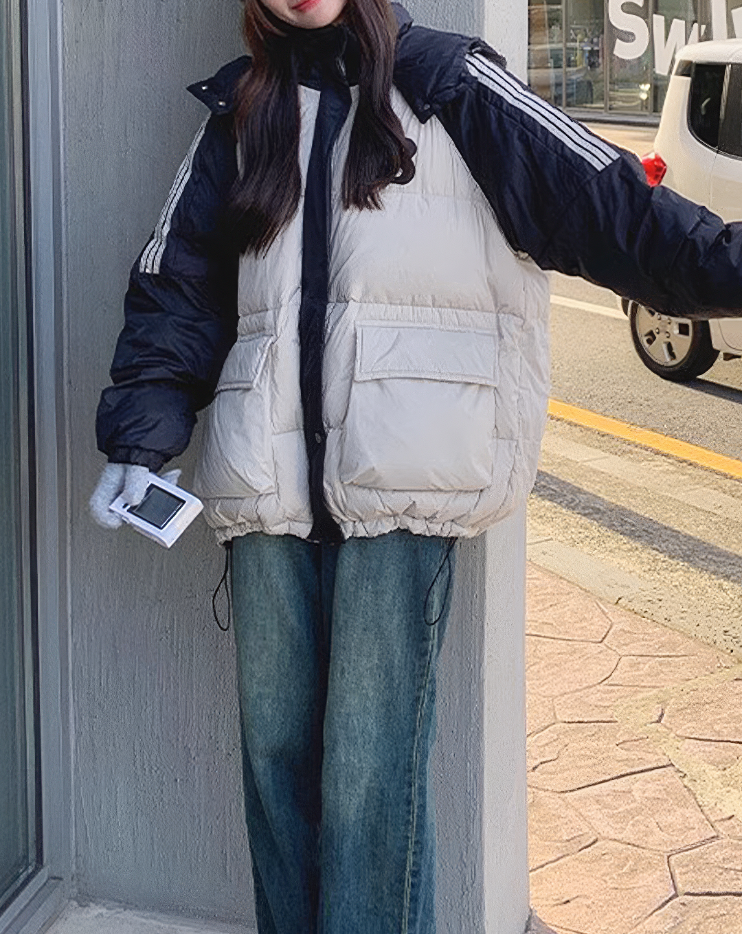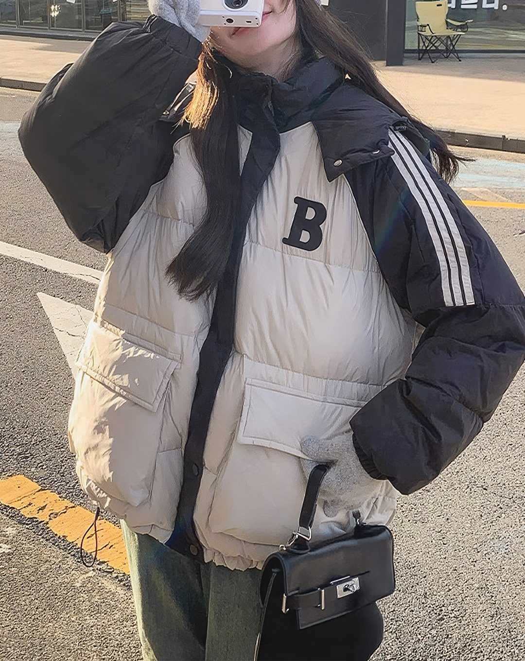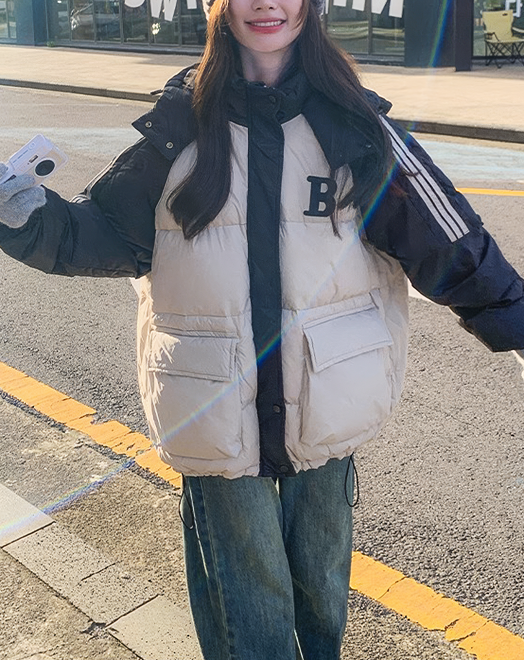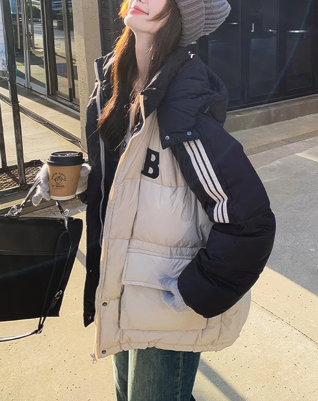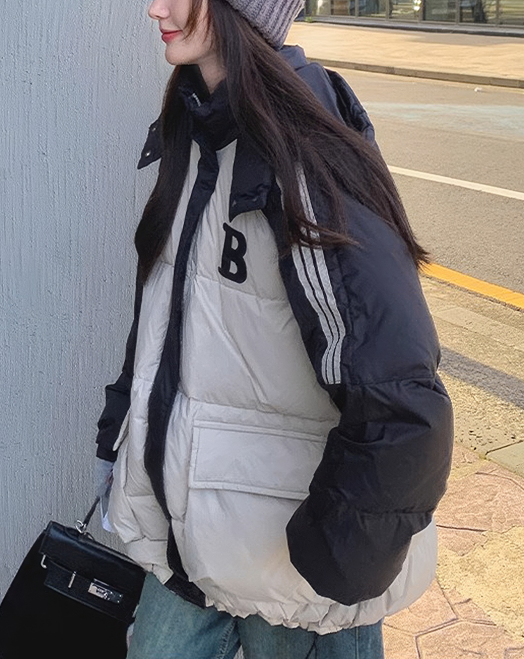 寒さからしっかりと守る、レディースのダウンジャケット。身頃はホワイト、袖はシックなブラックの切り替えになっており、モダンなバイカラーが目を引きます。胸元にはカレッジ風のレタリングがアクセントとして入り、スポーティーな雰囲気をプラスしています。フード付きで防寒性も高く、ゆったりとしたオーバーサイズシルエットで、厚着をしても快適な着心地です。