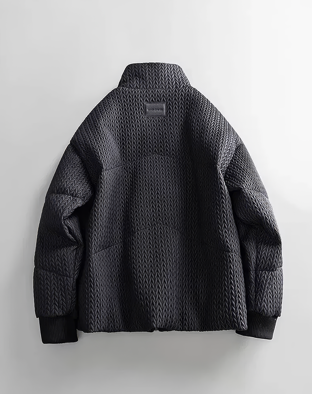 個性的なデザインが魅力のメンズアウター。全身に施された、編み込まれたような立体的なエンボスパターンが特徴で、光の当たり方によって表情を変え、シンプルなブラックながらも深みのあるスタイルを演出します。首元はスタンドカラーで、ジップを上まで閉めれば防寒性も抜群。カジュアルからモードまで、幅広いコーディネートに対応する一着です。